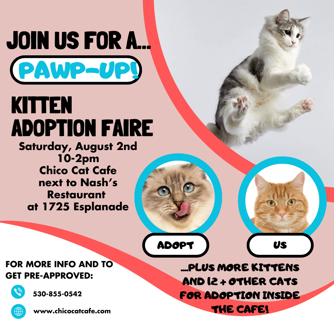 Be sure to check out the kitten bios and photos IN SEPARATE FORTHCOMING POSTS (this post will be pinned for reference)! AND don’t forget to visit us at www.chicocatcafe.com to virtually visit with current café kitties prior to the event.