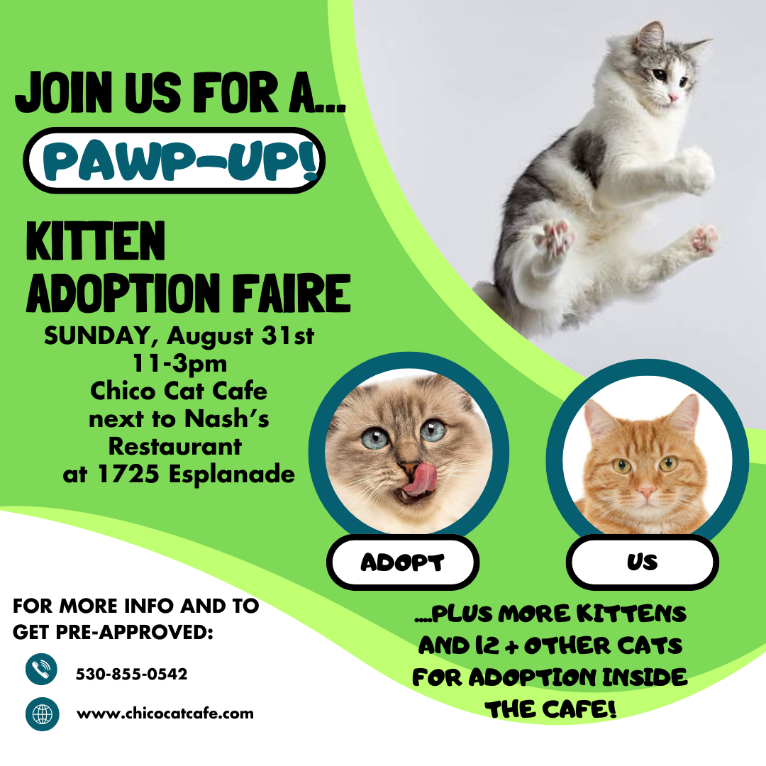 Be sure to check out the kitten bios and photos IN SEPARATE FORTHCOMING POSTS (this post will be pinned for reference)! AND don’t forget to visit us at www.chicocatcafe.com to virtually visit with current café kitties prior to the event.