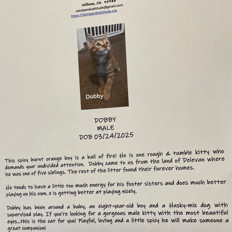 Larkin is our newest bundle of love! She is a 3-year-old fluffy green-eyed charmer who found her way to us via her owner reaching out to our rescue partner. She was moving and couldn’t take her SO we gladly said YES! Although a bit intimidated by the other cats at the moment, her owner reports that she is quite the lounge lizard who wants nothing more than time to bask in the sun, nap on a whim and burrow under the covers with her person at night. Larkin LOVES to play ball and prefers to take her meals at night. Her nighttime routine consists of belly rubs, brushing and bird watching. Will cuddles with you and belly rubs become YOUR nighttime routine her?